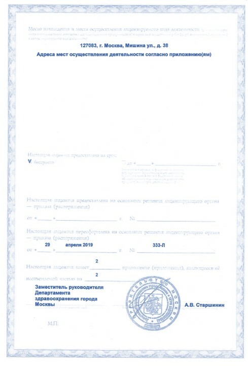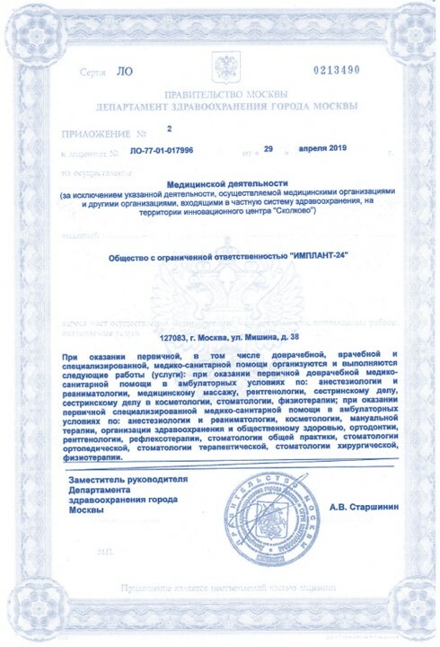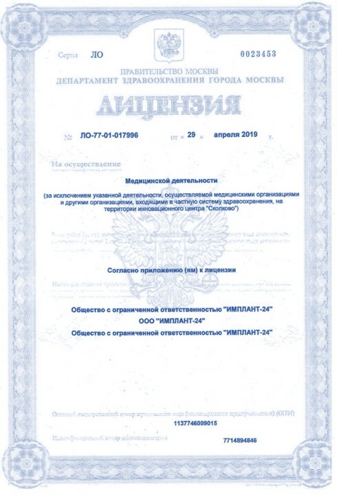 Лицензия № ЛО-77-01-017996 от 29 апреля 2019 года. Лицензия выдана Департаментом здравоохранения г. Москвы. Деятельность осуществляет Общество с ограниченной ответственностью ООО "Имплант-24"